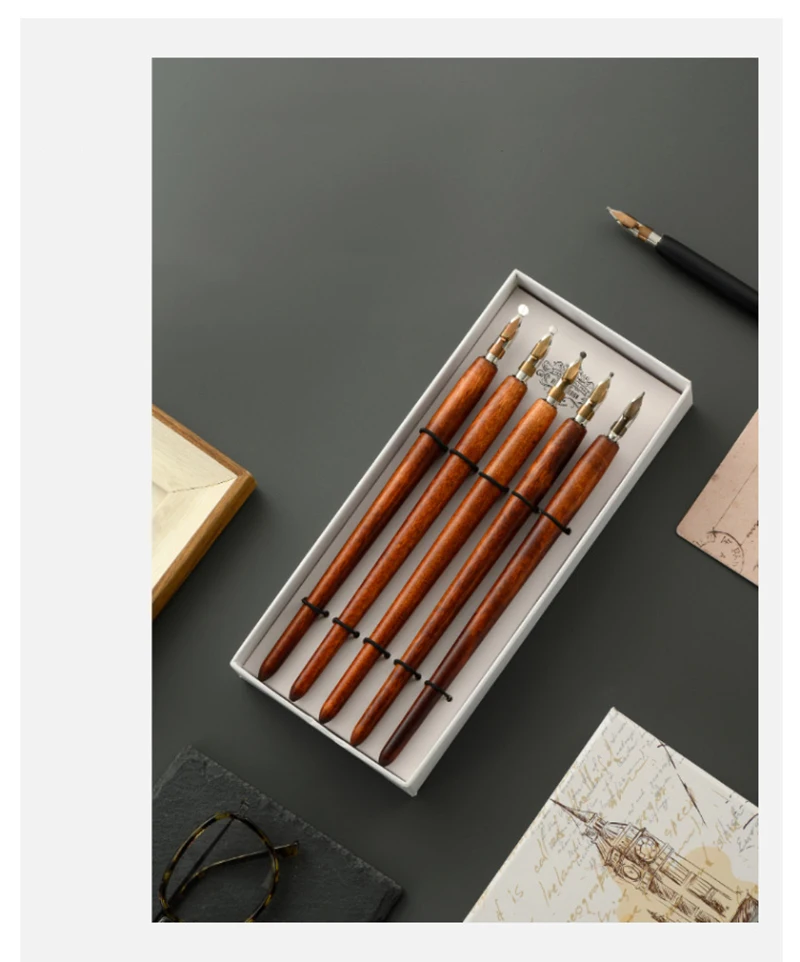 5Pcs Literary Retro Wooden Dip Pen 5 Nibs Set Antique Dip Calligraphy Writing Pen Office Stationery Writing Tools